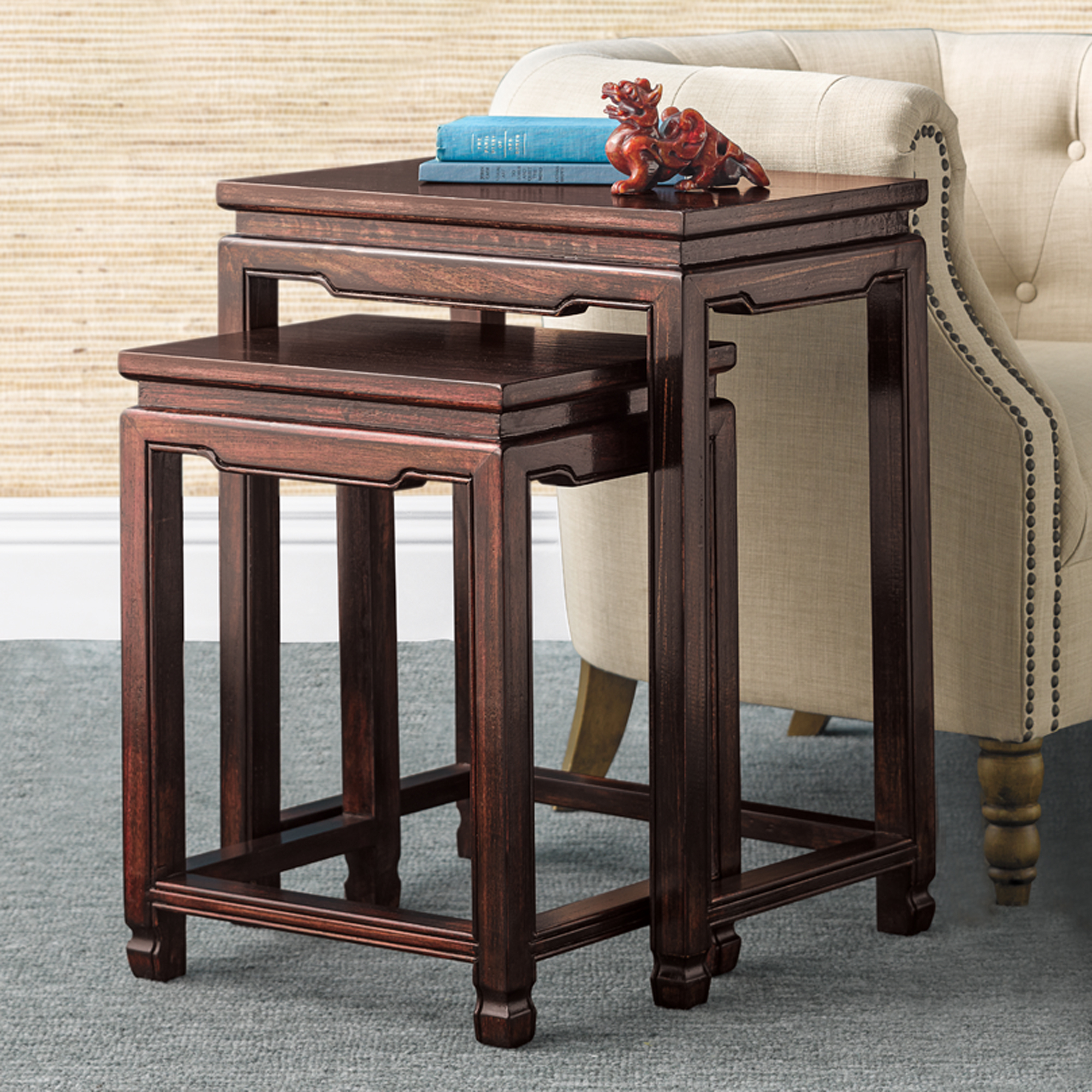 Inlaid Mahogany Nesting Tables Set of 4 | More Tables ... from www.scullyandscully.com Simply attach the legs to start enjoying your nesting tables. The nesting tables ship flat to your door and requires minimal assembly. Each color of coffee table also has a coordinating set of nesting tables, side table and console table, available separately. Slim iron frames delicately outline the geometric designs of this set, adding both edge and attitude. 4.3 out of 5 stars with 4 ratings. Save $29.00 (10%) sale $. The color is warm walnut and easily matches several home decors including my pastel colored walls. Once assembled, the larger nesting table measures to be 18.1h x 32.7w x 32.9d and the smaller nesting table measures to be 22.6h x 20w x 20d.
